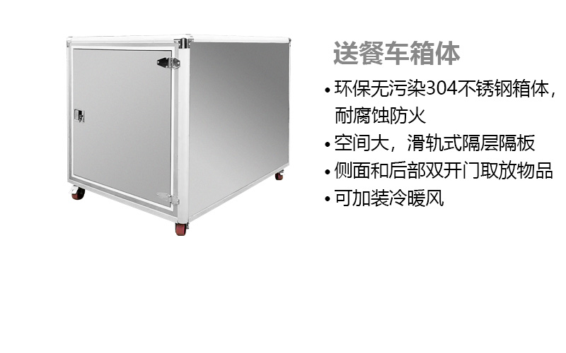 餐車箱體特點:多種箱體材料可以選擇,保溫隔熱的加厚PP板、環(huán)保無污染的304不銹鋼材。箱體具有耐腐蝕防火特點??臻g大,滑軌式隔層隔板。 側(cè)面和后部雙 開門方便用戶 取放物品。也可根據(jù)需要可 加裝冷暖風(fēng)。